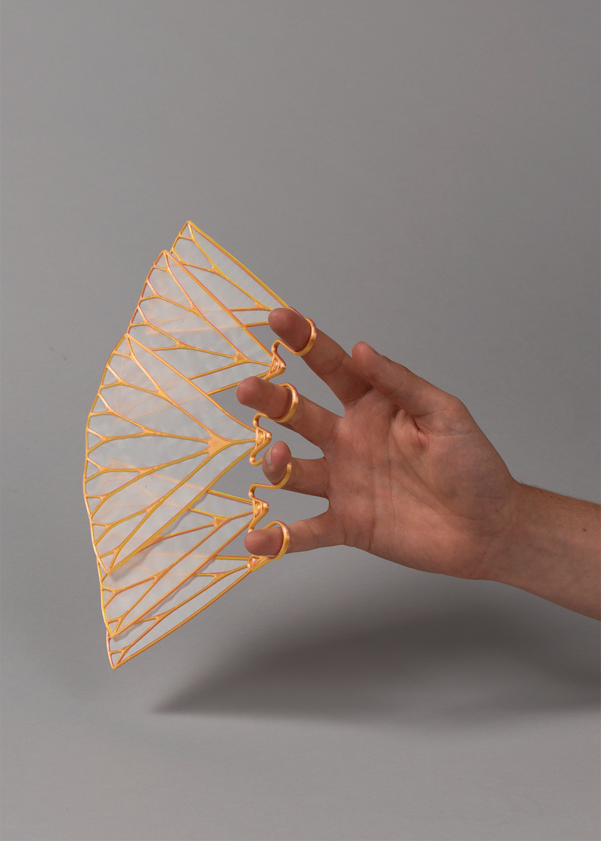 L’objet est pensé comme une extension du corps s’inscrivant dans la continuité de la main. Le fait de porter l’éventail le déploie grâce à l’effet ressort produit par la combinaison de la forme et du sens du dépôt de fil plastique.