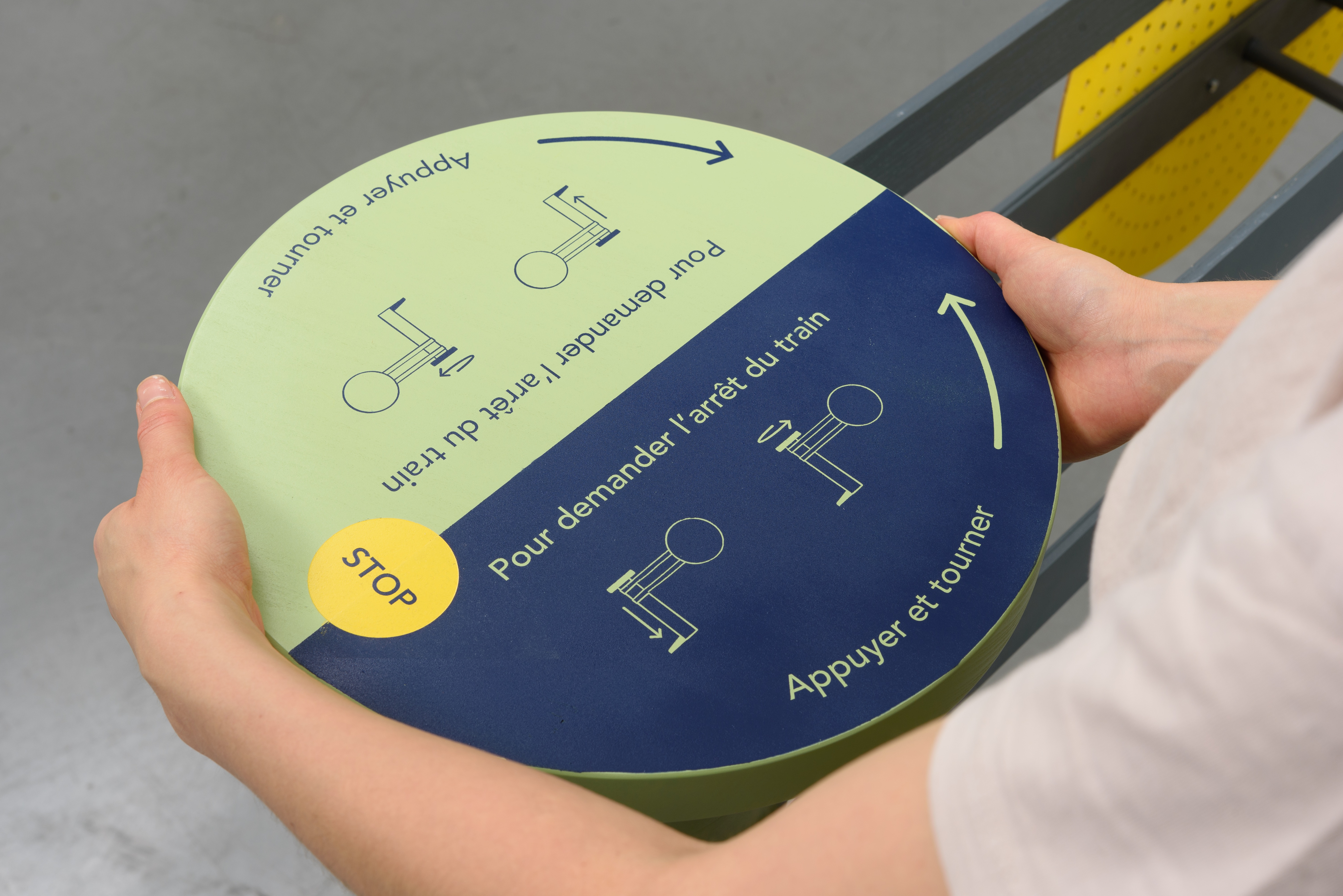 Nous proposons également un dispositif mécanique de demande d’arrêt, afin d’éviter l’électrification et de préserver une souplesse d’implantation de ces arrêts. Ce système prend la forme d’une barrière pivotante, actionnée manuellement par le voyageur à l’aide d’une pédale et d’un volant. Le disque jaune, se démarquant du paysage, fait ainsi signal au conducteur, qui circule à vue à une vitesse d’environ 60 km/h.