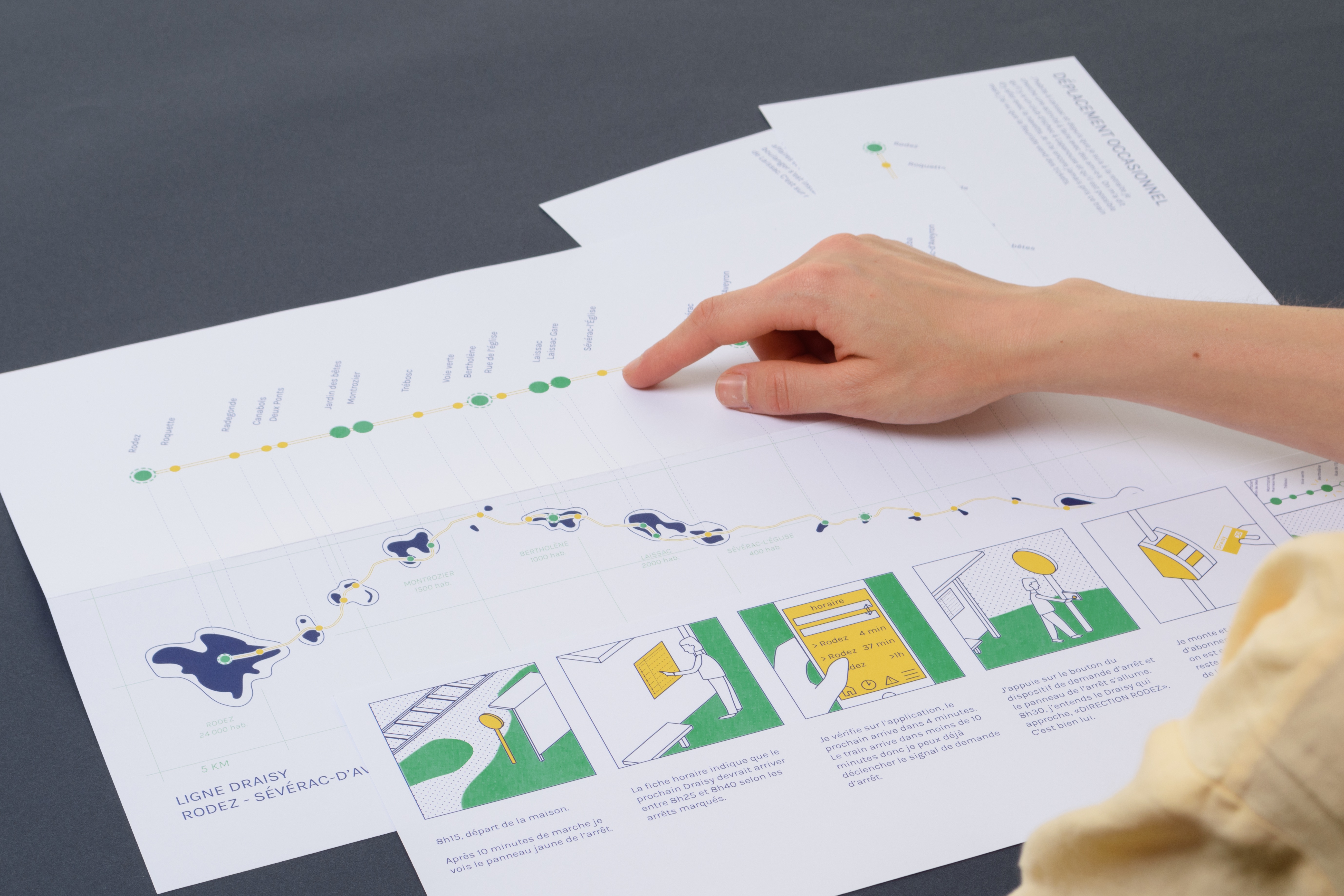 Nous nous appuyons sur des lignes SNCF fermées pour faible fréquentation, souvent avec peu d’arrêts. Ces lignes traversent aussi bien des zones urbaines denses que de petites communes de quelques centaines d’habitants. Pour répondre à cette diversité, nous proposons de multiplier les arrêts afin d’assurer une desserte plus fine, proche du « dernier kilomètre », et de la flexibilité du véhicule individuel. Nous dessinons trois types d’arrêts, des points de vente, des office de mobilité ainsi que des arrêts sur demande.